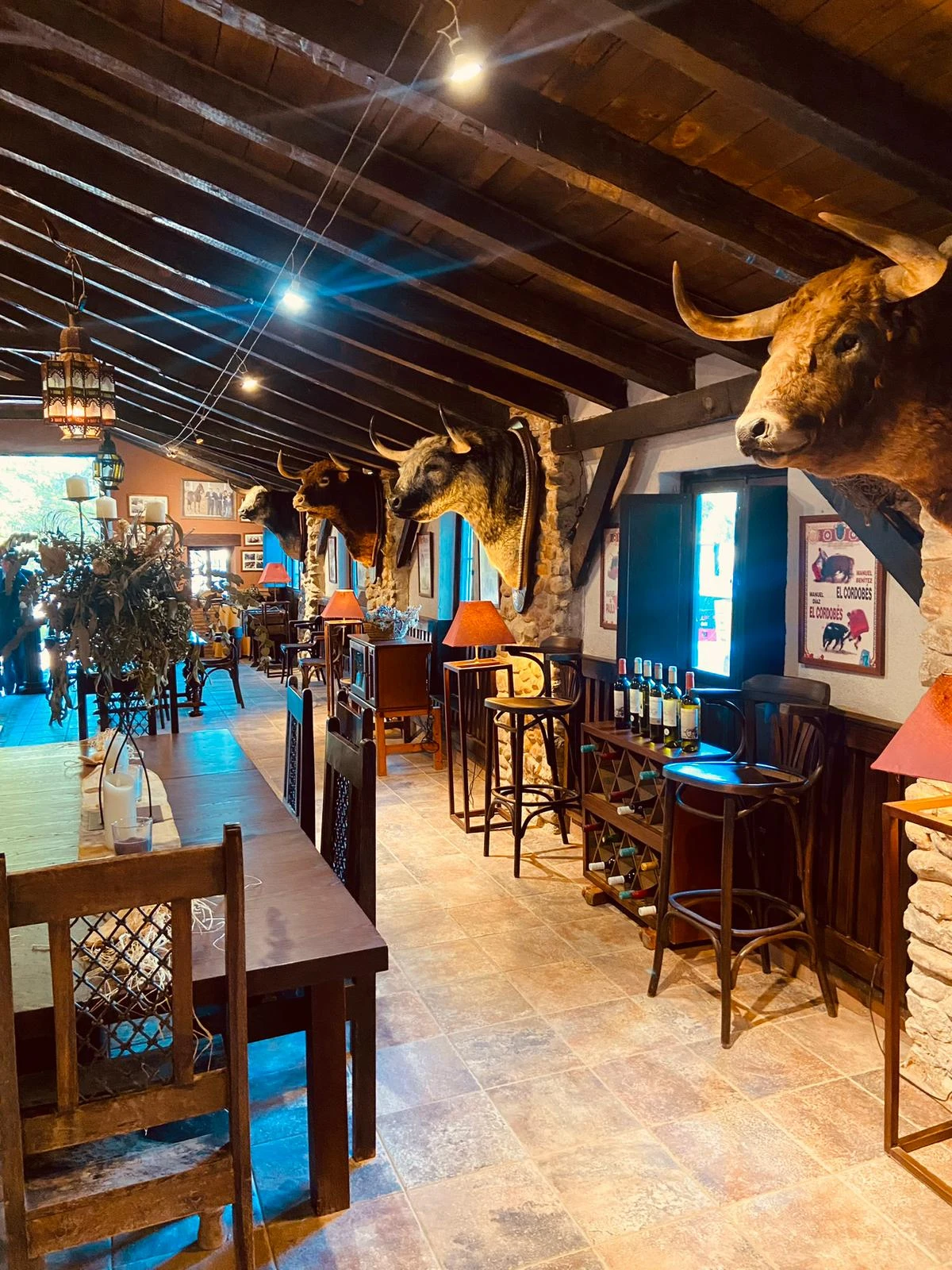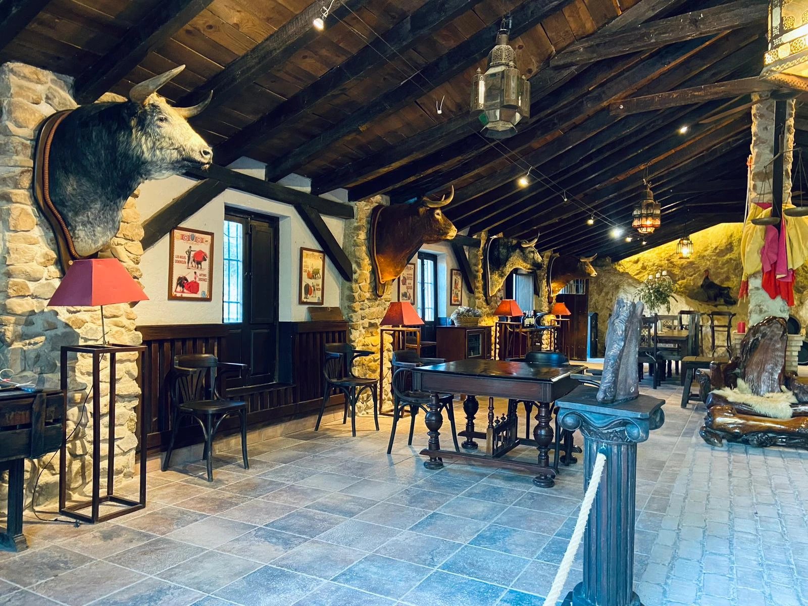 El Salón del Caballo, con capacidad para 500 personas, ofrece vistas panorámicas a la sierra a través de grandes ventanales, realzando su decoración ecuestre con luz natural. El Salón del Toro, un espacio más íntimo de 150 m², lleno de historia taurina y decorado con trofeos de grandes maestros del toreo. El Museo de Carruajes es un salón de 250 m² que alberga una exquisita colección de carruajes de época, sumergiéndote en el encanto del pasado.