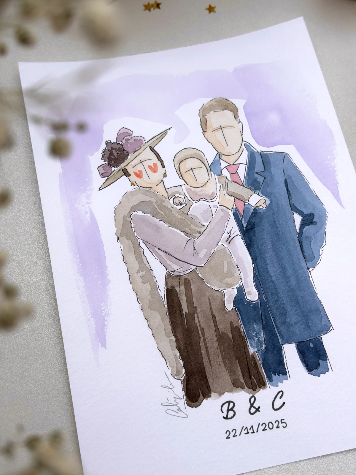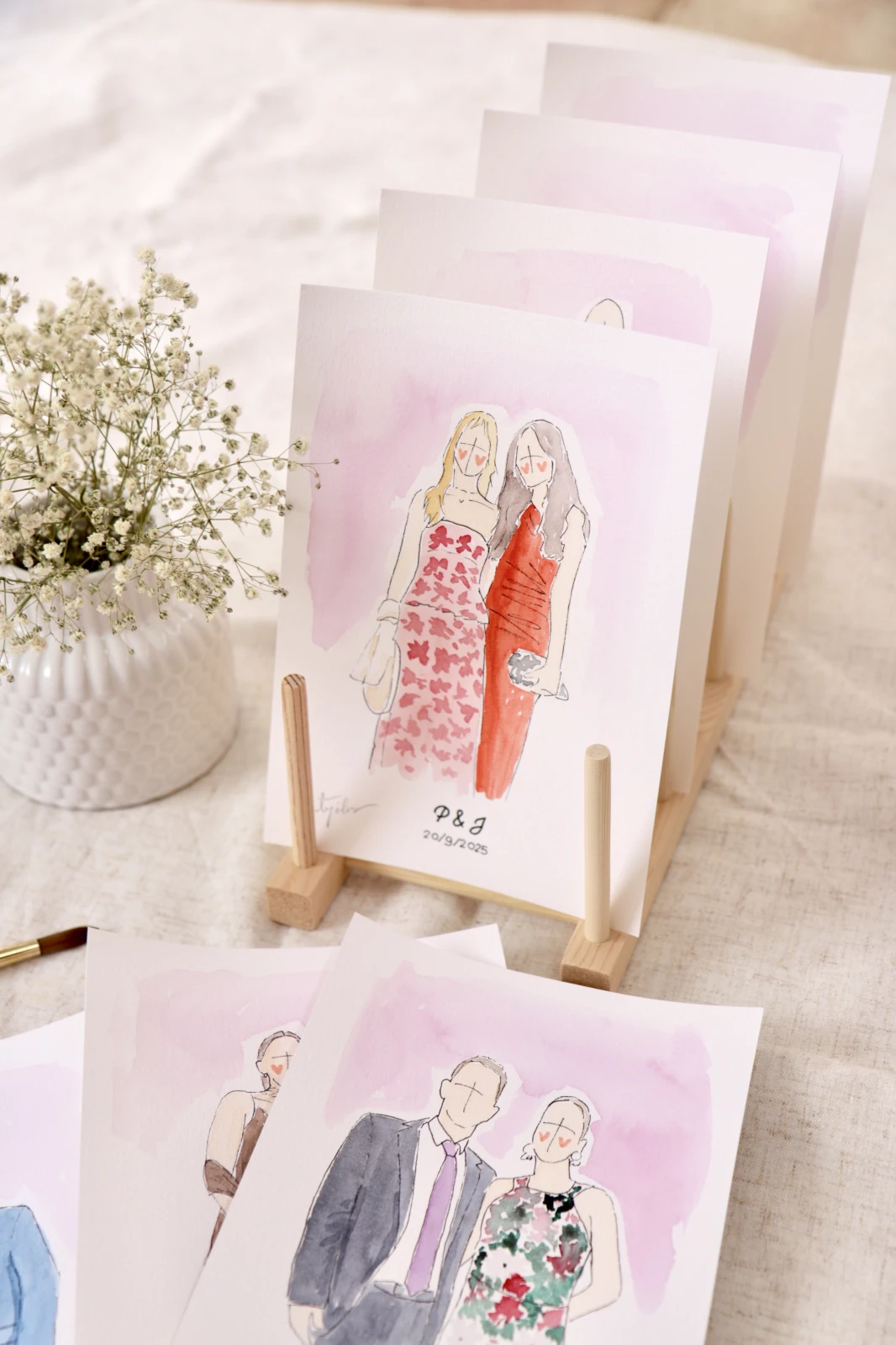 ¿Te imaginas regalar a tus invitados un recuerdo mágico, hecho a mano y completamente personalizado? En tan solo unos minutos, capturo la esencia y el look de este gran día pintando a vuestros invitados en acuarela, con un estilo delicado, artístico y original. Me instalo en un rincón bonito y bien iluminado del lugar de la celebración, creando un pequeño estudio artístico que forma parte del encanto del evento. A lo largo de la jornada, realizo retratos en acuarela de los invitados —de forma individual, en pareja o en familia.