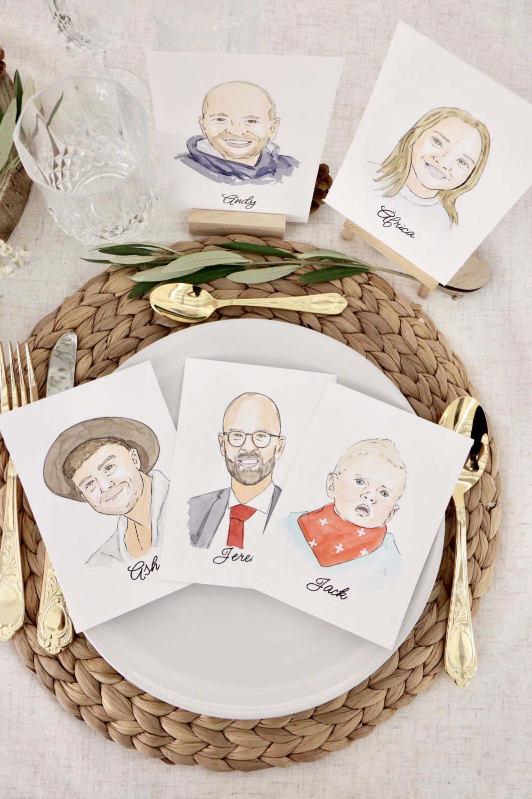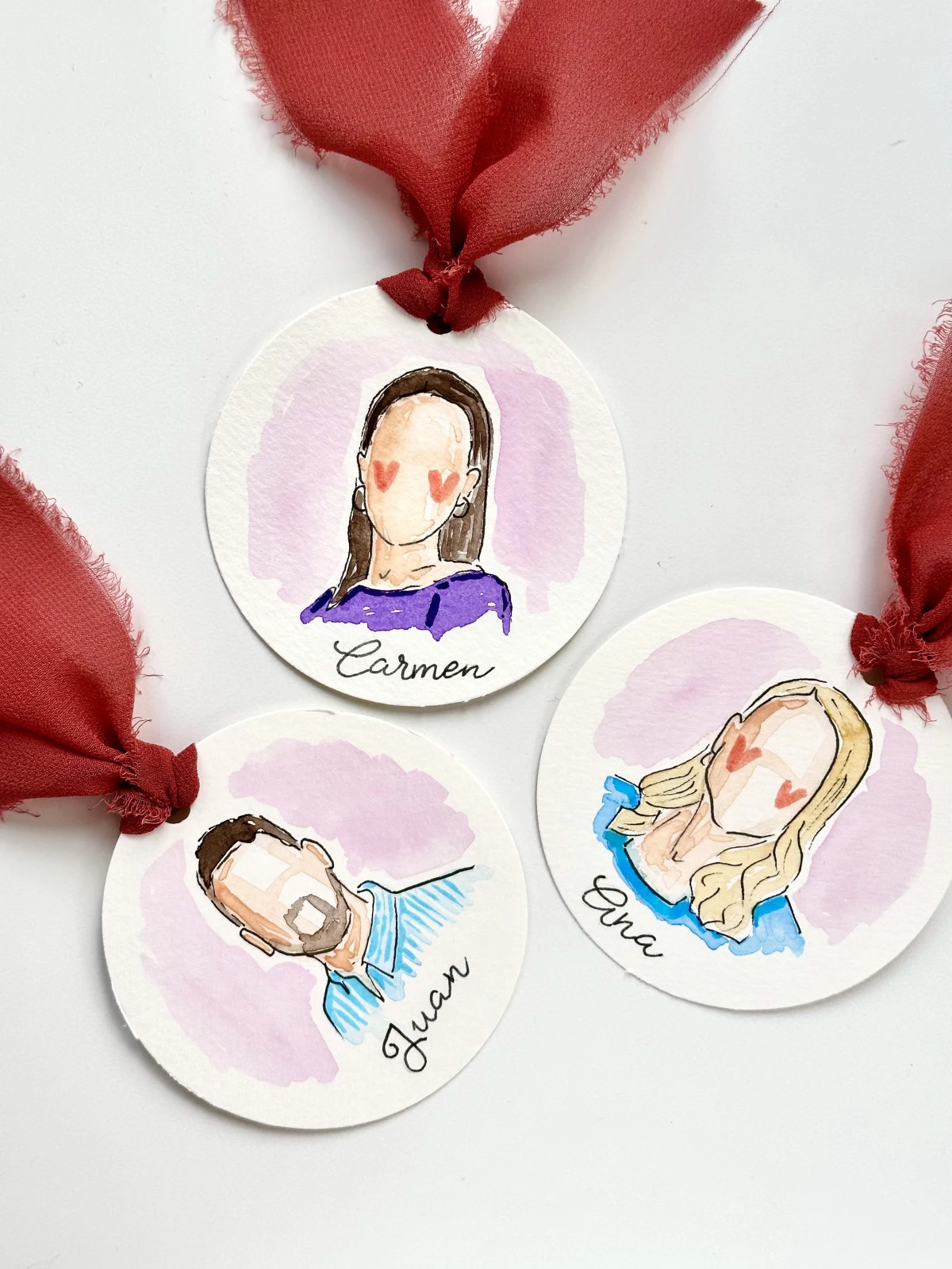 Cada invitado puede encontrar su propio mini retrato ilustrado en la mesa, con su nombre, un detalle divertido y hecho a mano. Solo necesito una foto de cada persona y su nombre bien revisado para transformar esas imágenes en recuerdos que arrancan sonrisas y se guardan para siempre.